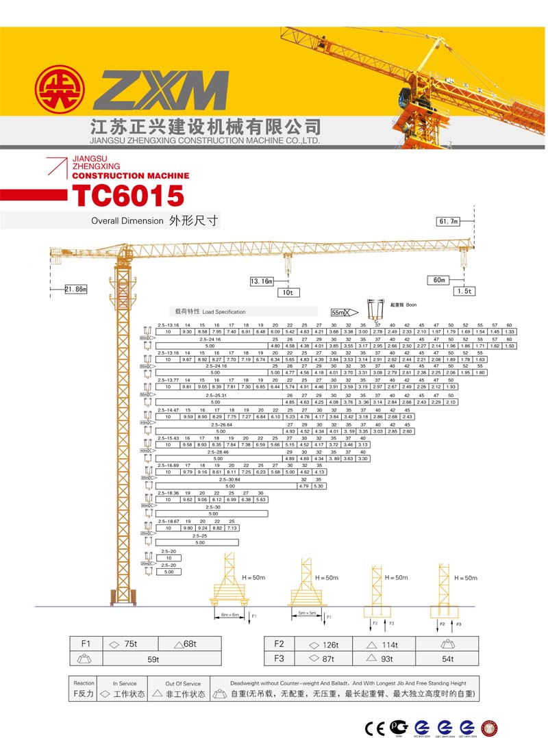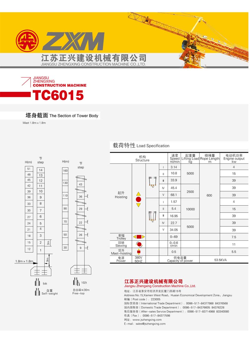 2、最大工作幅度60米,最大起重量8噸,額定起重力矩1300KN.M;