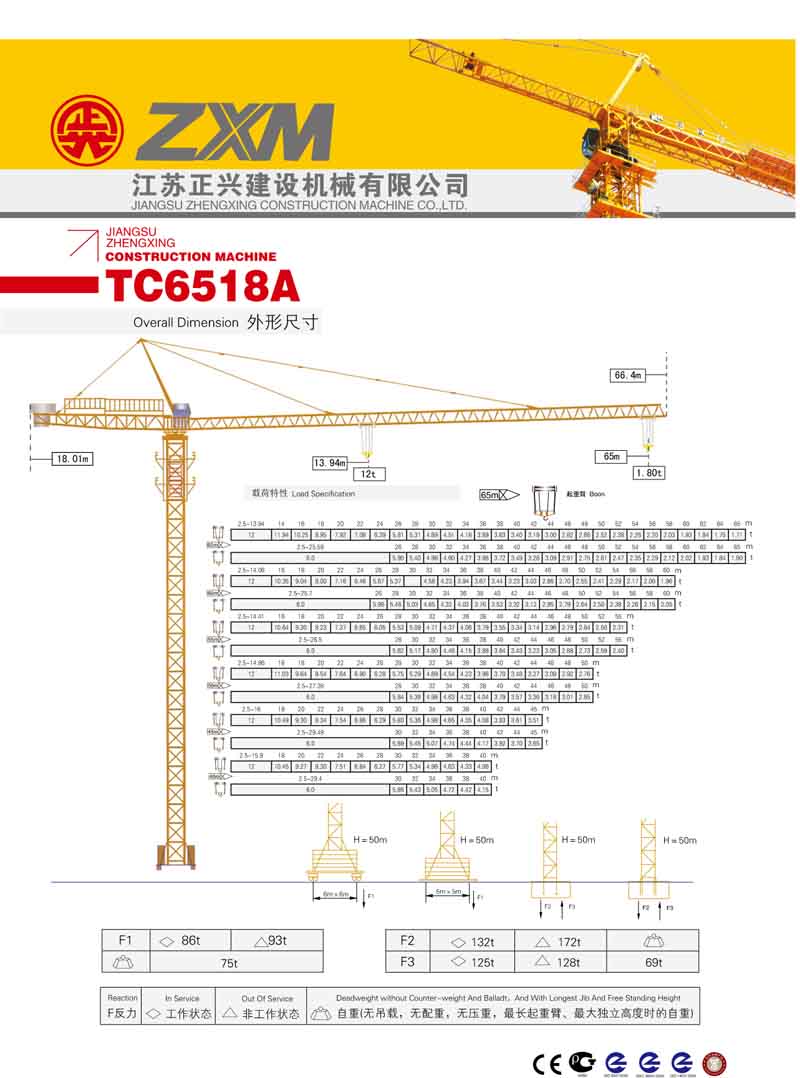 2、最大工作幅度65米,最大起重量12噸,末端最大起重量1.8噸,額定起重力矩1600KN.M;